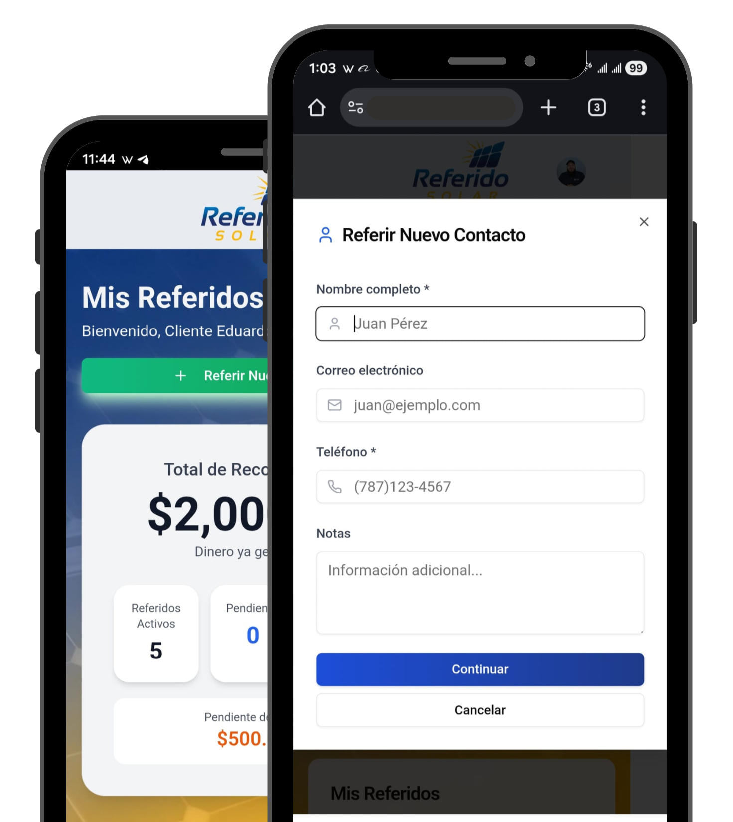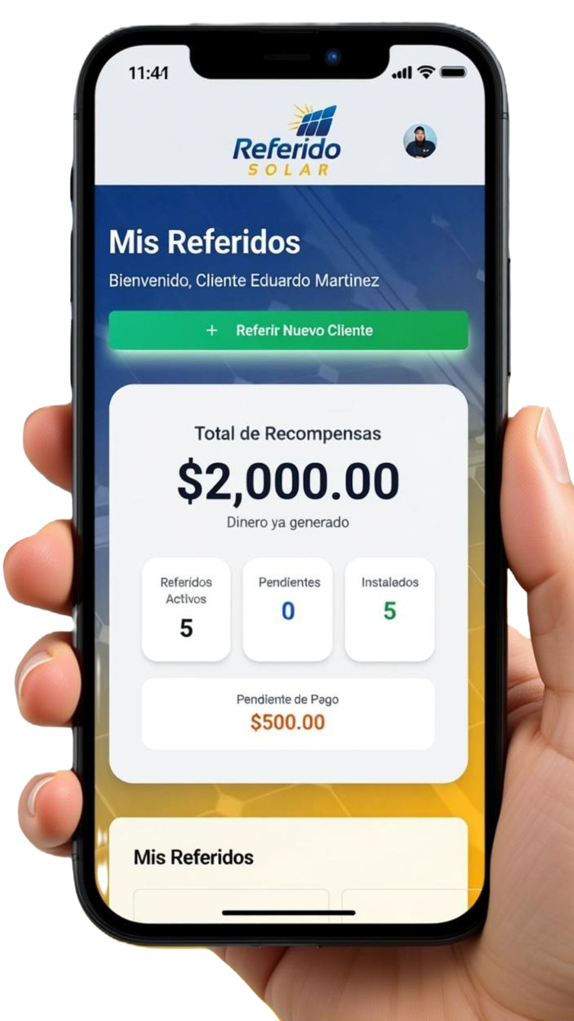 Cada vez que un amigo o familiar completa la instalación de su sistema solar en casa, automáticamente recibes una recompensa de $500. Es así de sencillo: tú conectas, nosotros instalamos, tú ganas.